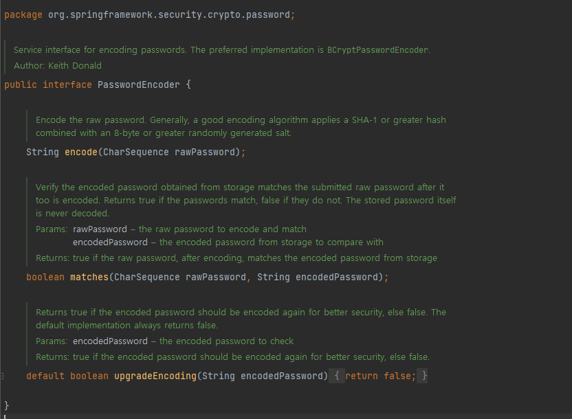spring Security의 서블릿 지원에는 PasswordEncoder와 통합하여 비밀번호를 안전하게 저장하는 것이 포함됩니다. PasswordEncoder Bean을 노출하여 Spring Security에서 사용하는 PasswordEncoder 구현을 사용자 정의할 수 있습니다.