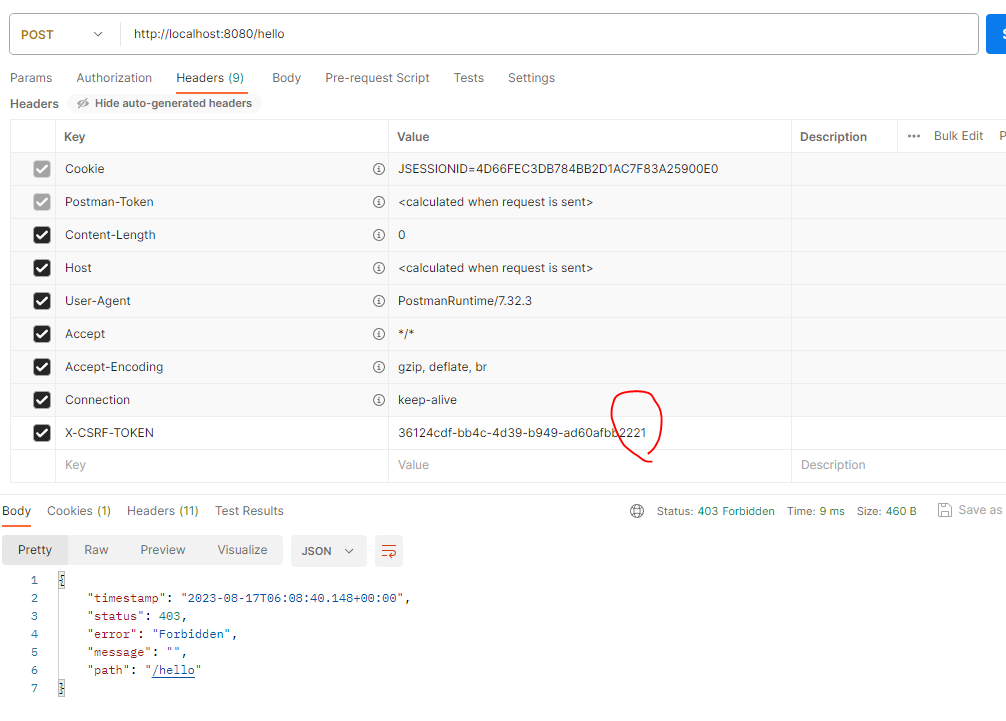 호출할 때마다 jsessionid값이 바뀌고 csrf토큰이 새로 생성되는 것을 볼 수 있음.
