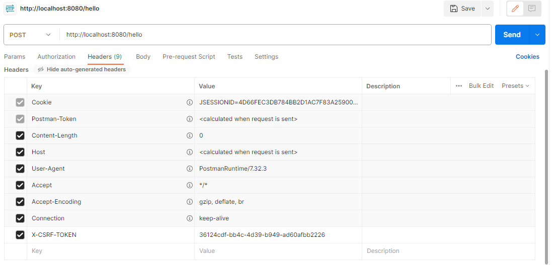 호출할 때마다 jsessionid값이 바뀌고 csrf토큰이 새로 생성되는 것을 볼 수 있음.